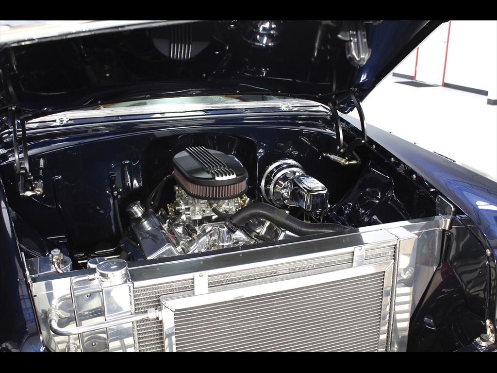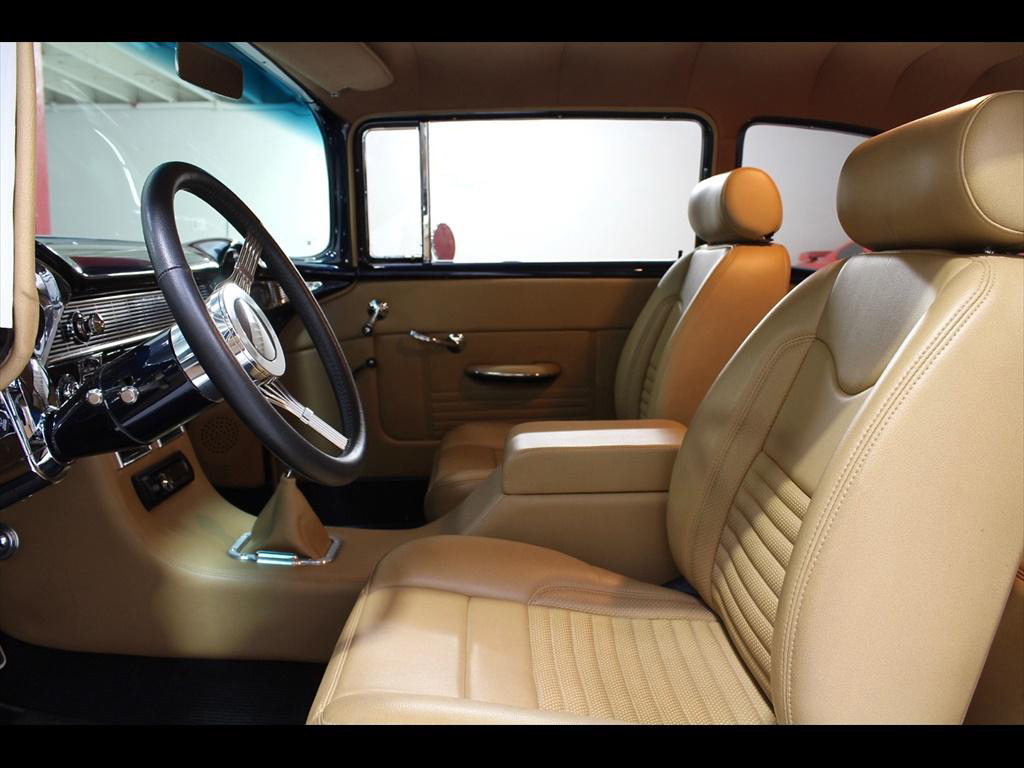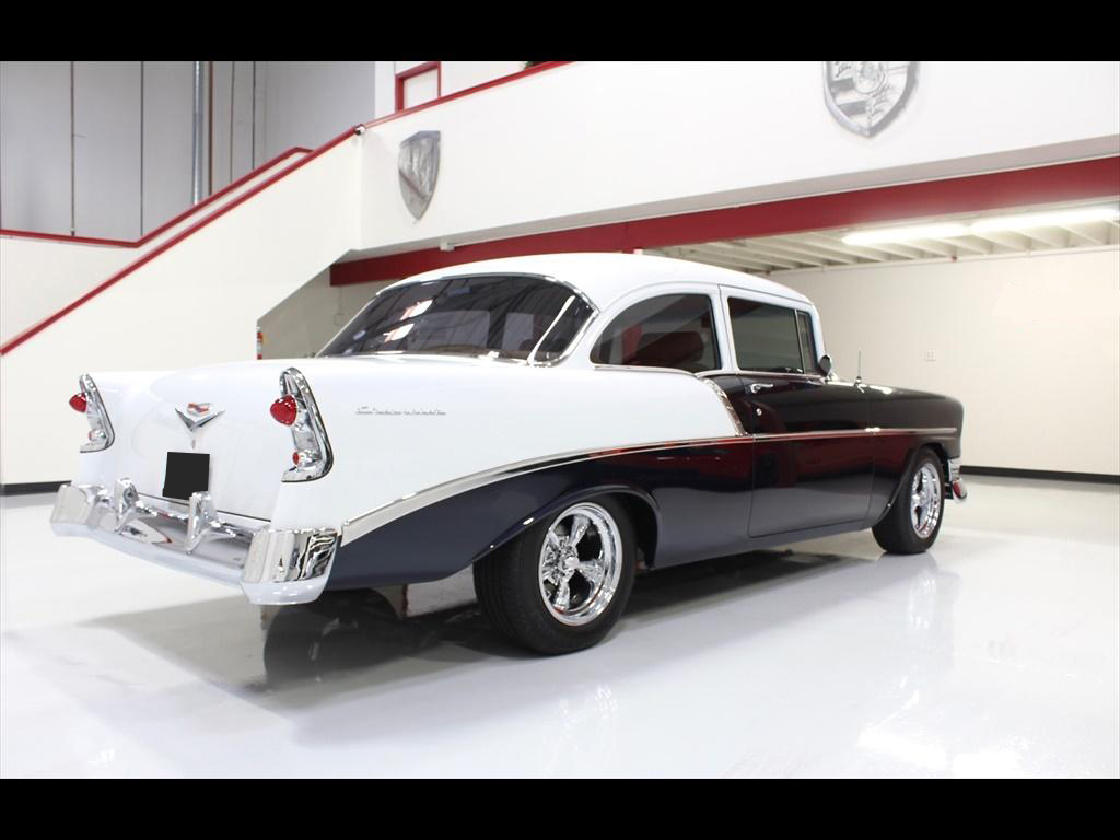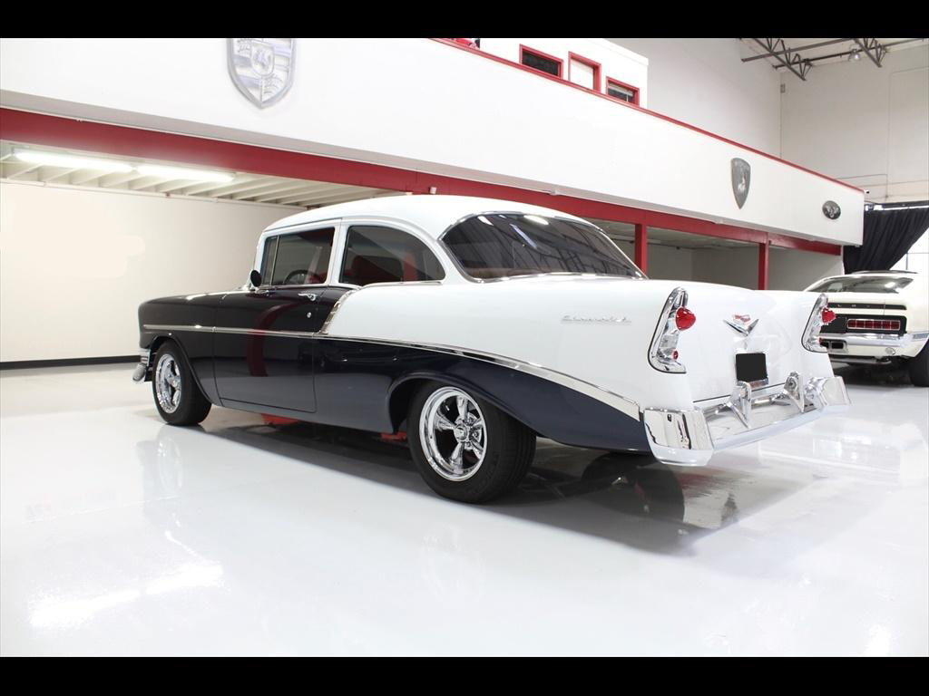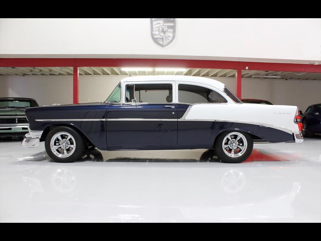 1956 Chevrolet 210 in Orient Blue Metallic & White over Custom Tan Leather Interior. Equipped with a 383ci Stroker Engine mated to a 700R4 Automatic Transmission. An incredible 'no expense spared' frame-off restoration with outstanding quality and attention to detail. The fit and finish on this car is second to none. Less than 900 miles on the car since completion of the build. During the restoration, an extensive list of modifications and upgrades were performed, including; Vintage Air A/C, Rack & Pinion power steering, 4-wheel disc brakes with CPP master cylinder, Tubular A-Arms, Heidts 4-link suspension with coilovers, Danchuk bucket seats with Mercedes Benz Ultra upholstery, Custom center console, Custom sound system with Bluetooth, Autometer instrument gauges, Flaming River tilt steering column, Lokar floor shifter, Alloy hood hinges, March alloy pulley system, Custom smoothed firewall, Dual electric fans, Smoked glass, Dynamat sound proofing throughout the car, custom trunk upholstery with concealed compartment for battery, American racing wheels with Michelin tires, and much more! To add to the already great power of the 383 stroker, the owner installed; Sanderson headers, Edelbrock Performer intake manifold, Edelbrock carburetor, and custom dual exhaust with Flowmaster mufflers. The panel fitment is exceptional and the body is laser straight. The restoration process is documented with photos and an extensive book of receipts. This beautiful show quality 56 Chevy is truly one of a kind.