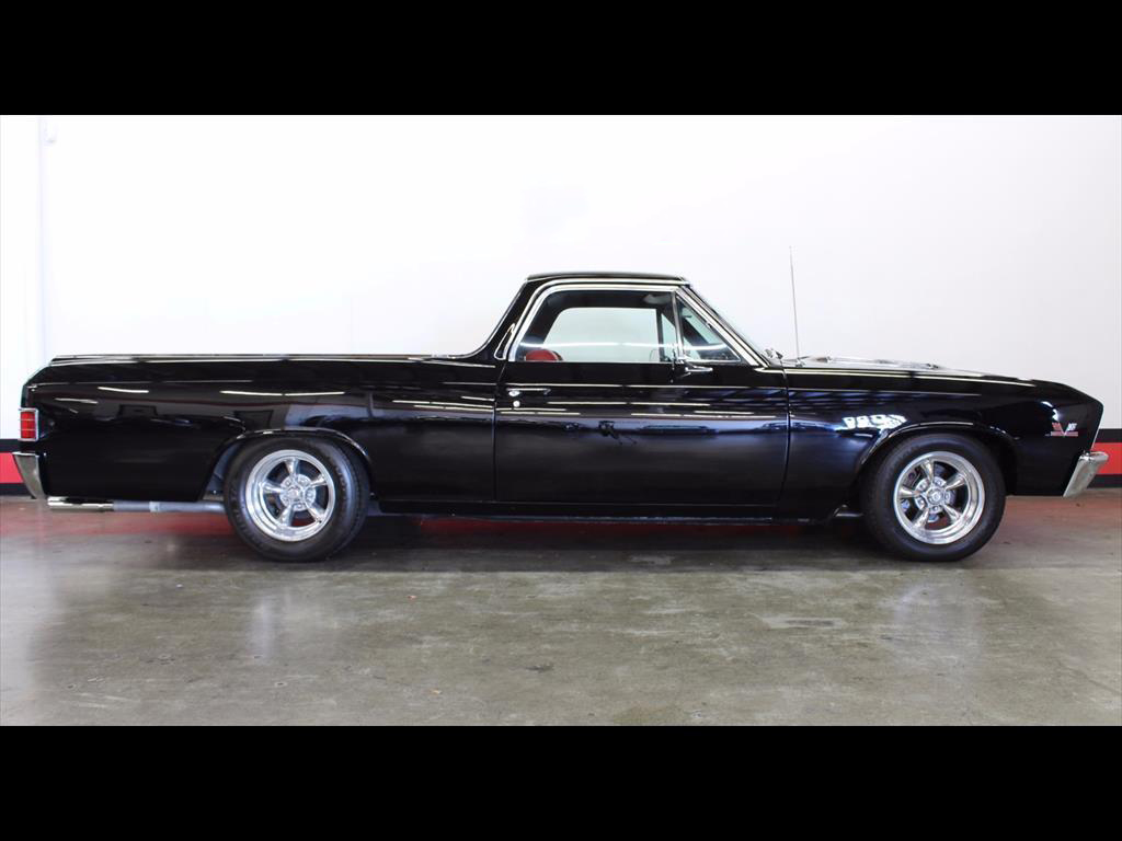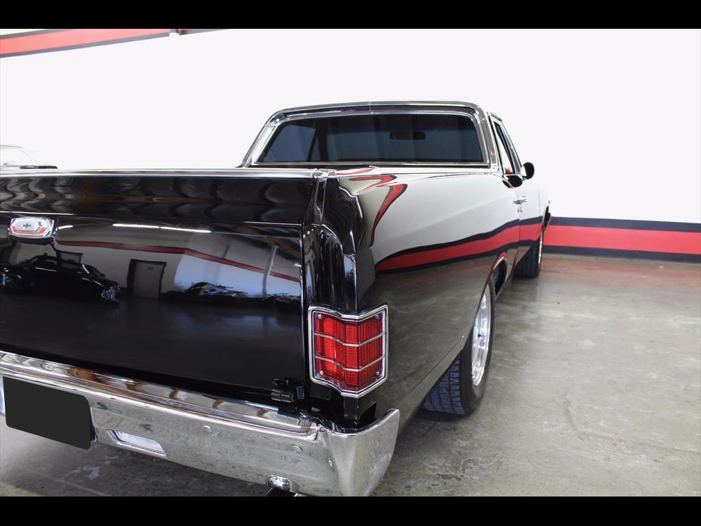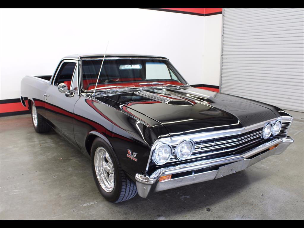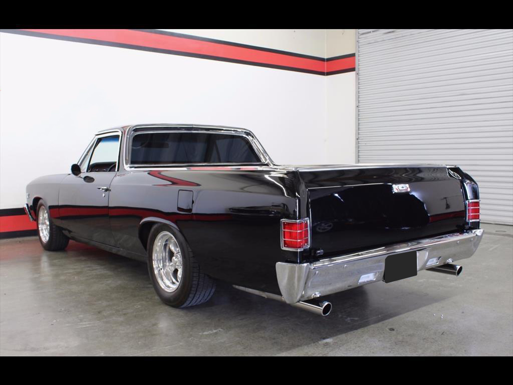1967 Chevrolet El Camino in Black over Red Custom Interior. Equipped with a 427ci V8 Engine mated to a TH400 Automatic Transmission. California black plate car, it has spent it's entire life in the foothills of Northern California. Fresh engine build from Doug's Speed Shop with less than 1,000 miles on it. Engine is making around 500hp. Balanced and blueprinted. Racing pistons. Edelbrock Performer aluminum heads. Hydraulic lifters. MSD ignition. Be Cool radiator with electric fans. B&M shift kit with billet electronic kick-down. Both the original Turbo 400 Transmission and 12-Bolt rear end have been recently rebuilt. Factory Air Conditioning has been updated and blows cold. Baer disc brakes. Hotchkis adjustable 4-link rear suspension. Power steering. Pioneer CD player. Autometer gauges. A very high quality build; the body is straight, it was rust and dent free before restoration, original floors and bed, the PPG paint is beautiful, the doors shut excellent, windows roll up and down with ease.
