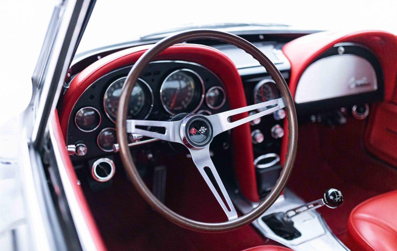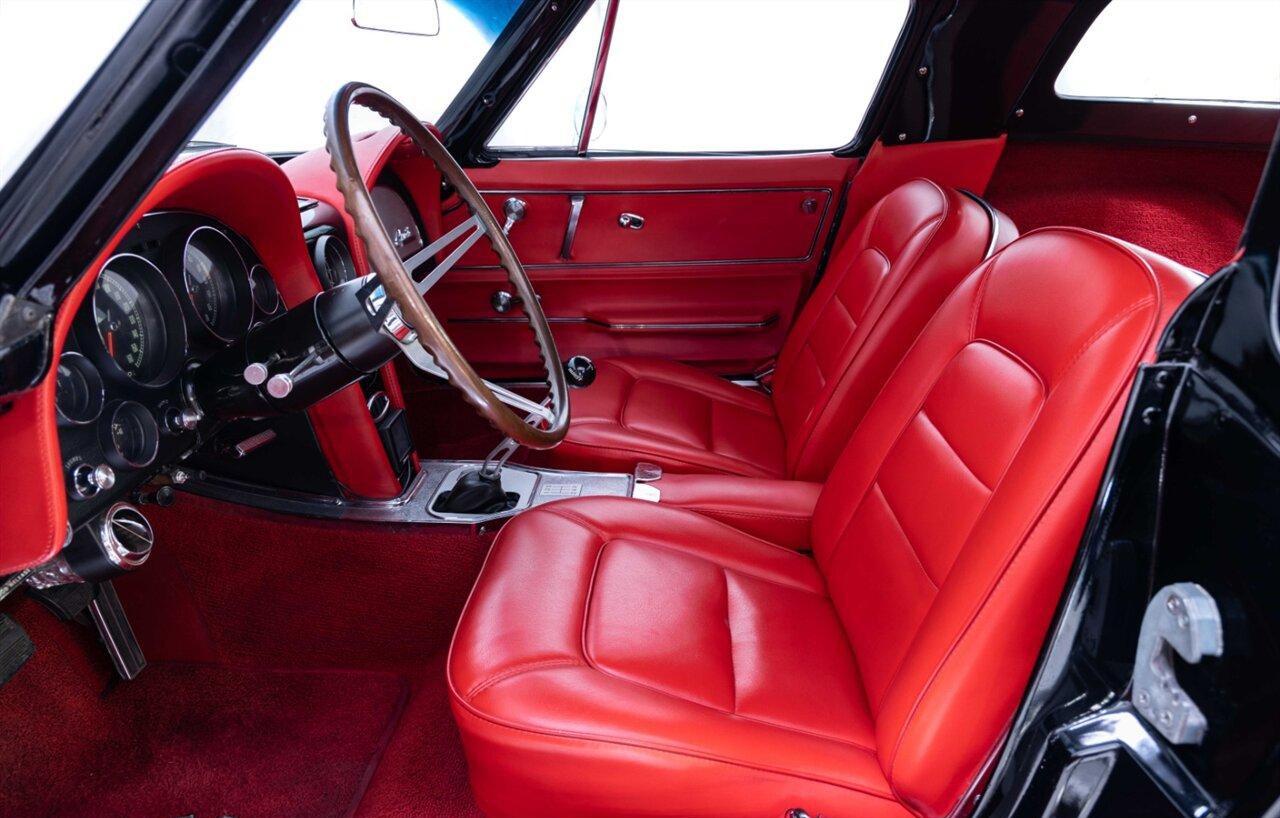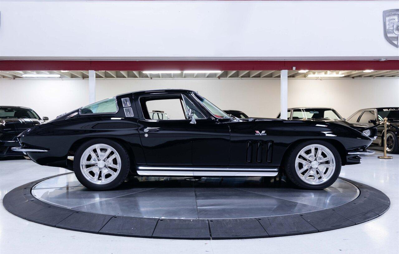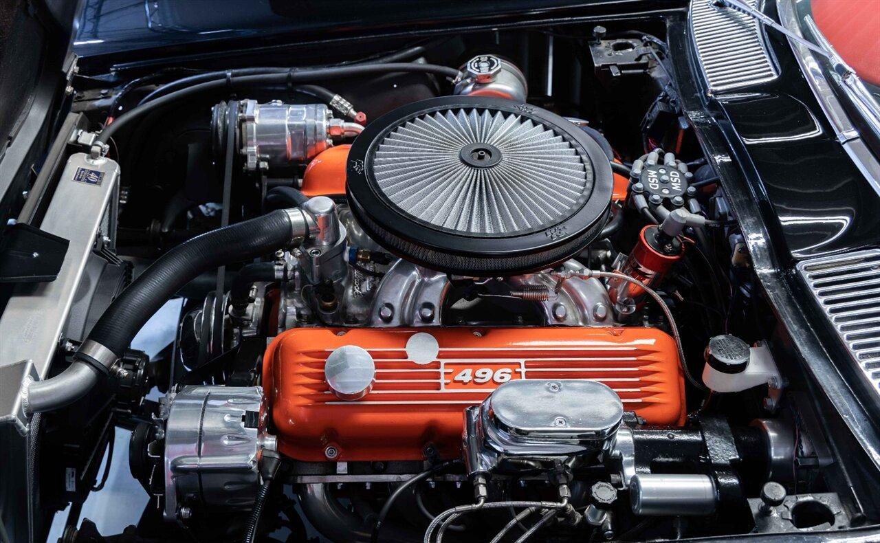 1965 Chevrolet Corvette Coupe in Raven Black over Red Interior. Equipped with a Fuel Injected 496ci Big Block Engine mated to a Tremec 5 Speed Manual Transmission. This incredible Pro Touring Corvette is a complete frame-off restoration. Features include: Holley Sniper Fuel Injection, Air Conditioning, Rack n Pinion Power Steering, 4 Wheel Wilwood Disc Brakes, Coilover Suspension, Ron Davis Aluminum Radiator, Sanderson Headers w/ Custom 3" Stainless Exhaust, MSD Ignition, Rockford Fosgate Components and Subwoofer, Custom 17" Wheels and more! This stunning Corvette is ready to be shown or driven.