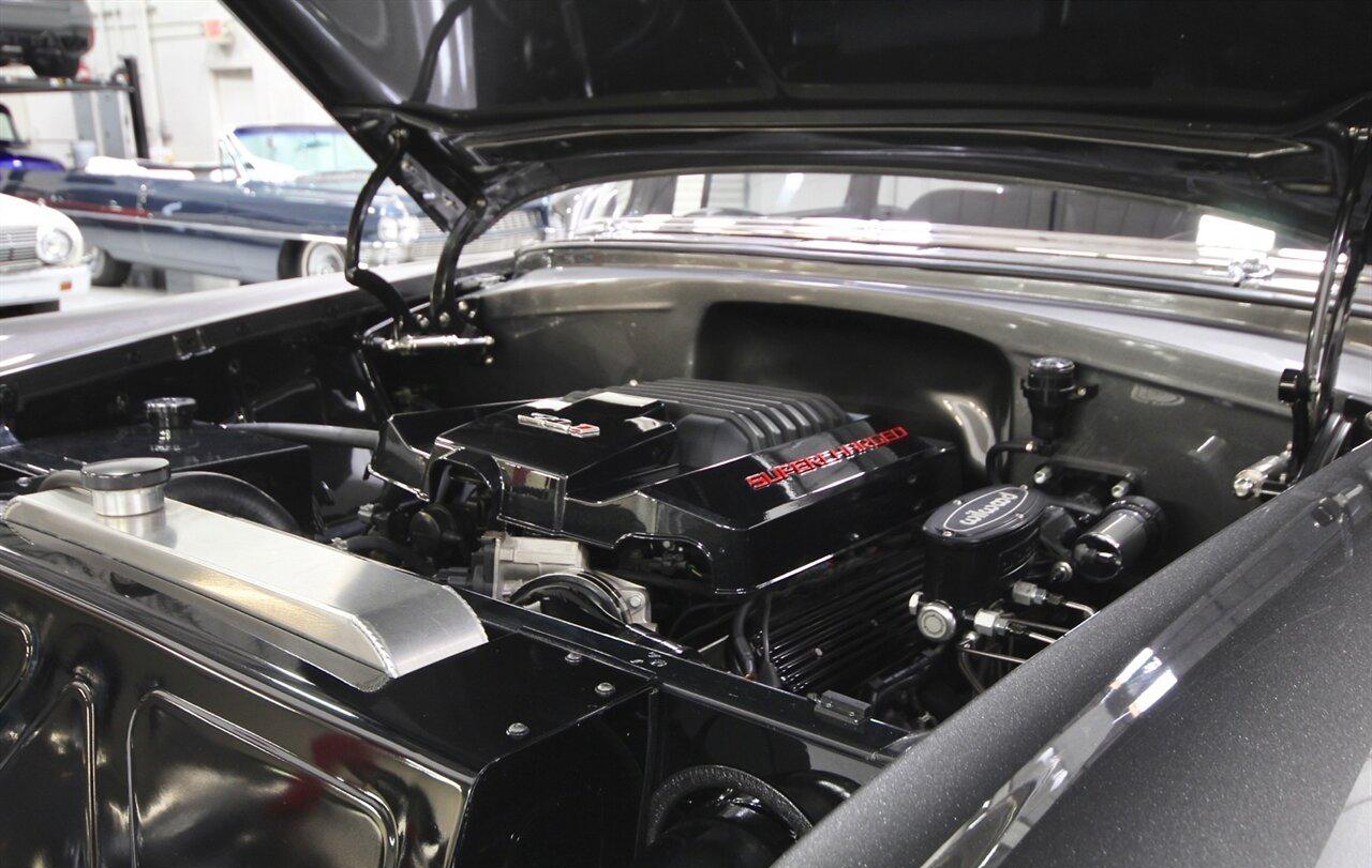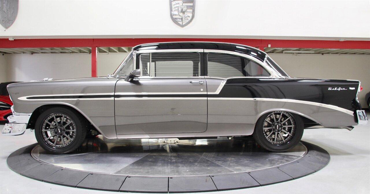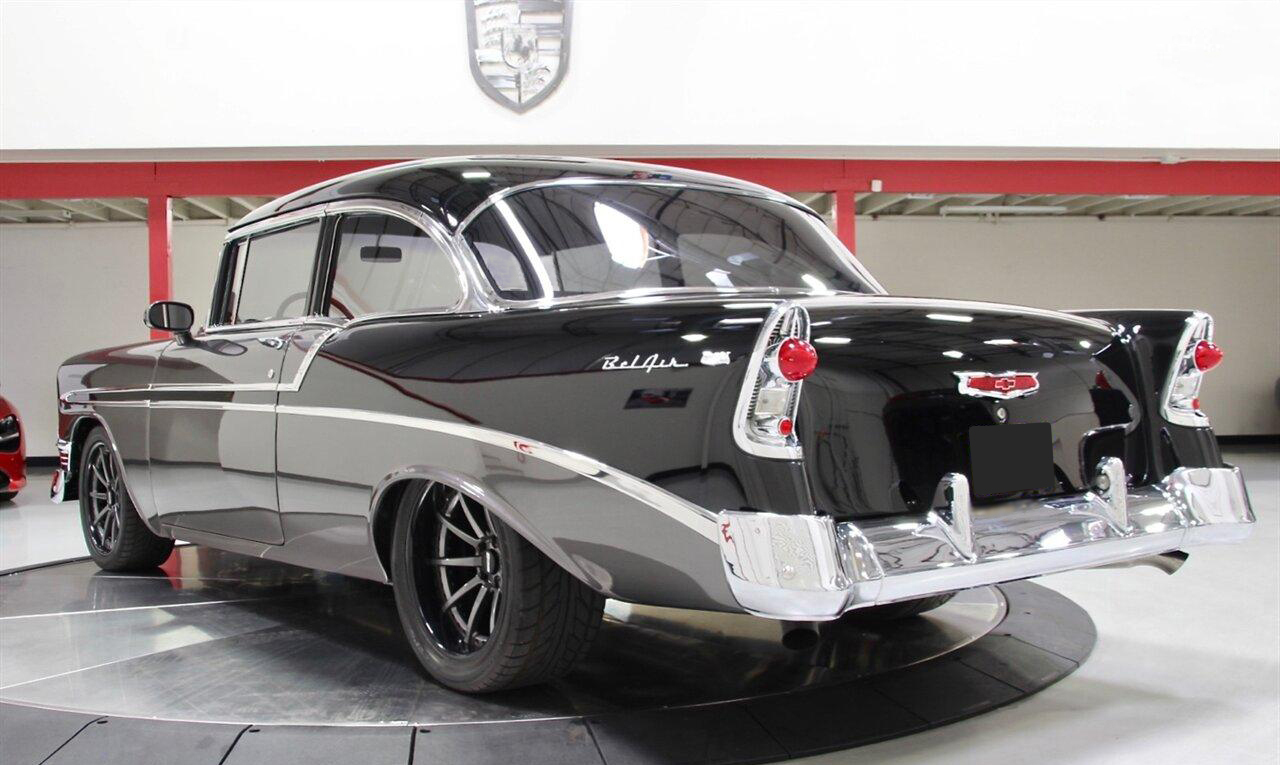 1956 Chevrolet Bel Air in Black and Gunmetal Metallic over Gray Custom Leather Interior. Equipped with a Supercharged LS3 V8 Engine mated to a Tremec T56 6-Speed Manual Transmission. This incredible Tri-Five has undergone a complete nut & bolt restoration and modernized to perform as great as it looks. Very little miles on the car since the build was completed, and it remains in show quality condition all around. The LS3 engine has been fitted with an Eaton supercharger from a Cadillac CTS-V and also features a Cam Motion camshaft, Dual valve springs, Titanium retainers and hardened push-rods, and a Professional street tune. Power steering. Power windows. Wilwood 6-piston disc brakes. Electronic parking brake. Vintage Air A/C. Dakota Digital instrument gauges. Back-up camera. Custom leather upholstered seats, headliner, and center console. Incredible professional sound system with Sony touch-screen head unit. Viper alarm system. CPP tubular control arms. Viking billet adjustable shocks. Caltracs traction bars. B-Forged custom built wheels. Ford 9" rear end with 3.55 gears. Smoked glass. Beautiful brightwork. The car has beautiful body and paint, incredible fit and finish throughout, and it runs and drives incredible.