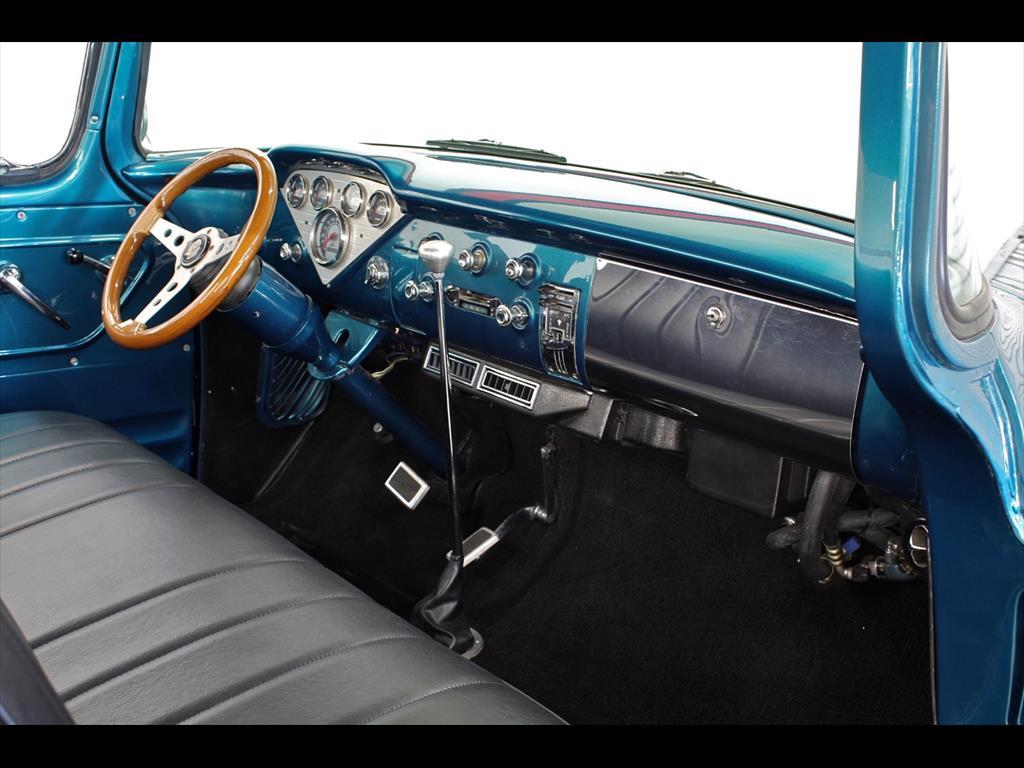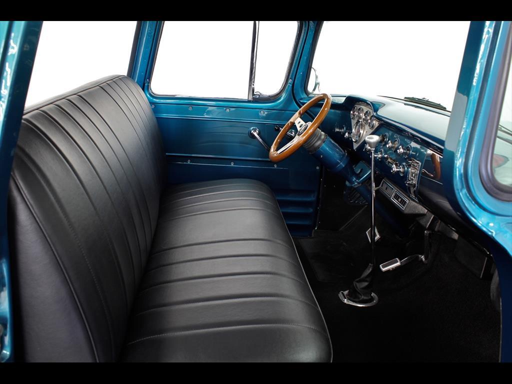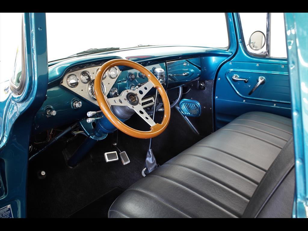 1956 Chevrolet 3100 Big Window in Harbor Blue over matching Interior with Black Vinyl seat. Equipped with a 307ci V8 Engine mated to a 700r4 Transmission. Independent front suspension. Coilovers. Rack & pinion power steering. Disc brakes. Tilt column. A/C blows cold. Stereo system with Clarion speakers. Brand new color matched wheels with center caps and beauty rings. Brand new 3" white wall tires. Brand new birdseye maple wood bed. TPI-Tech gauges. Fuel cell. This beautiful deluxe cab pickup is ready to be shown and driven.