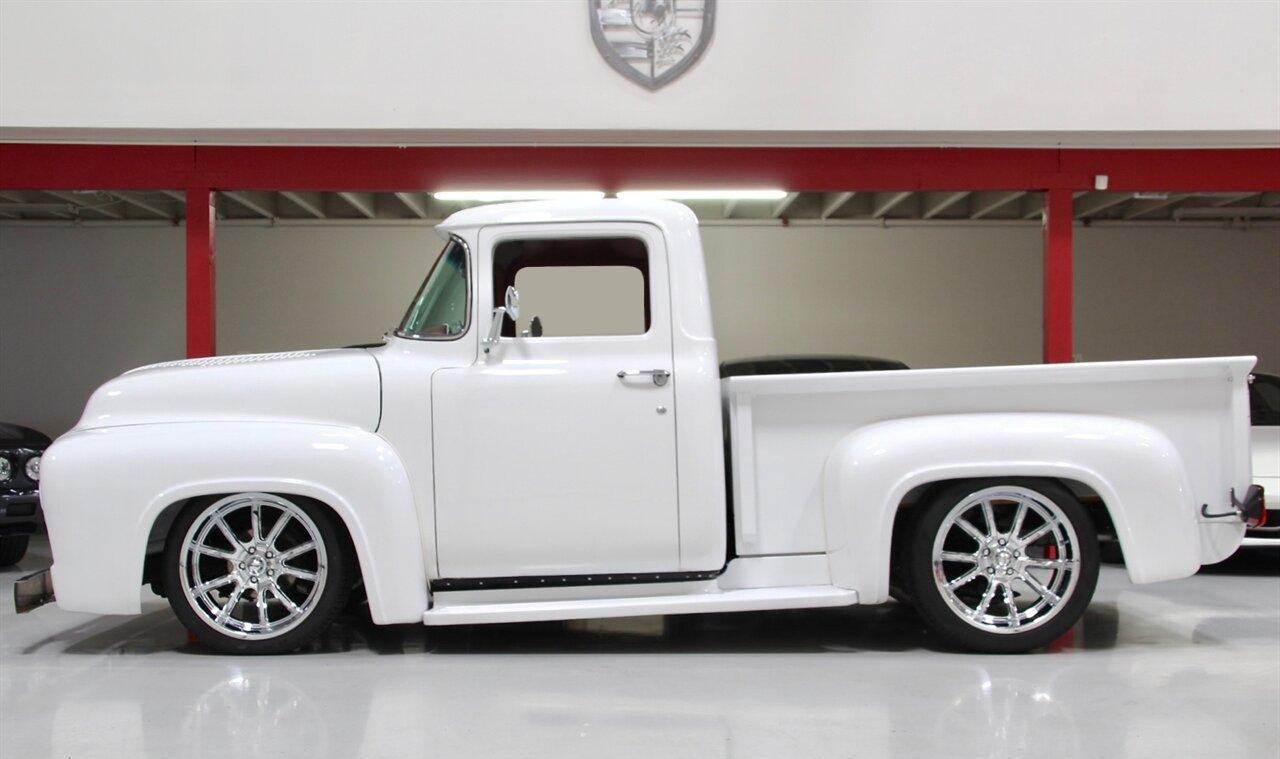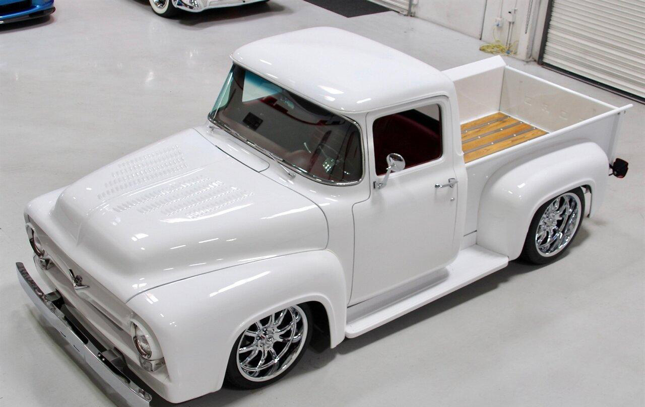 1956 Ford F-100 in White over Red Leather Interior. Equipped with a 350ci Tune Port Injected V8 Engine mated to a 700R4 Automatic Transmission. This beautiful restomod pickup has been updated with Power Steering, Power Disc brakes front and rear, Vintage Air A/C, Lanzar AM/FM radio with Bluetooth, VHX instrument cluster, Tilt steering column, Custom interior with beautiful dark red upholstery, 20" Ridler wheels, Jaguar rear end with IRS, Roll pan, Wooden bed, Headers with custom exhaust, Louvered hood, and more! The truck runs and drives great and turns heads everywhere it goes.