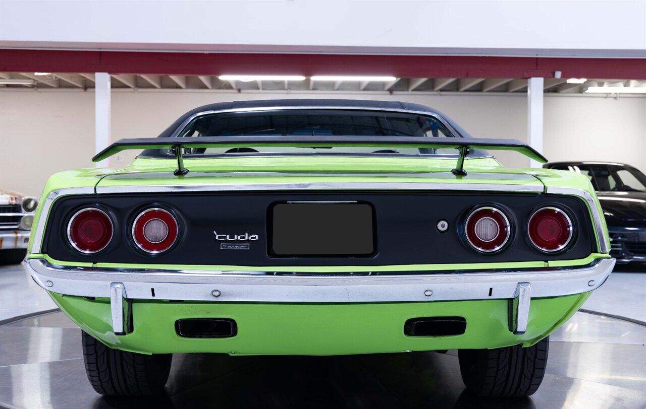 1974 Plymouth Cuda in Sublime Green over Black Leather Bucket Seat Interior. Equipped with a 360ci V8 mated to a 4 Speed Manual Transmission. This Cuda 360 is an excellent example of a rare Mopar. Just 398 Cuda 360's were produced with a manual transmission in 1974. Features Include: Edelbrock Fuel Injection, Power Disc Brakes, Power Steering, Hurst Pistol Grip Shifter, 3.55 Gears, Vinyl Top, Custom 17" Wheels, 3 Speed Variable Wipers, AM/FM Radio, Floor Mounted Fire Extinguisher and more! This very solid Cuda is ready to be driven and enjoyed!